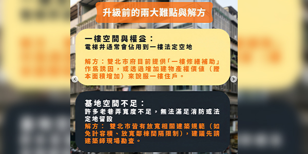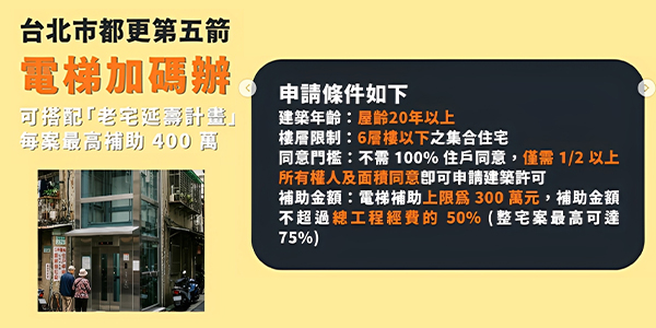 台北市屋齡超過30年且無電梯的老公寓約有8萬餘棟,為解決高齡化社會的移動問題,市府推出了「都更8箭」第5箭「電梯加碼辦」政策,補助上限從250萬元提高至300萬元。