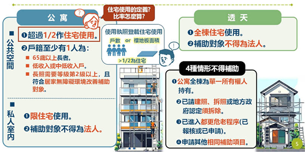 - 公寓:4至6層樓高的公寓,私人空間限住宅使用,公共空間須有1/2以上為住宅使用;戶籍內至少1人符合「65歲以上長者、中低收入戶,或長照等級第2級以上」3項條件之一。