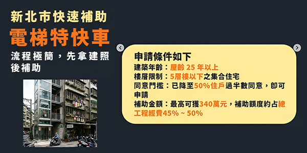 新北市針對屋齡超過25年、5層樓以下的公寓,提供增設電梯快速補助,免審議、免100%同意,每案最高補助340萬元。