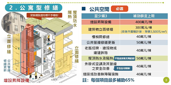這項計畫針對室外公共空間修繕提供補助,每項最高補助65%,且設有金額上限。其中與電梯相關的補助項目如下: