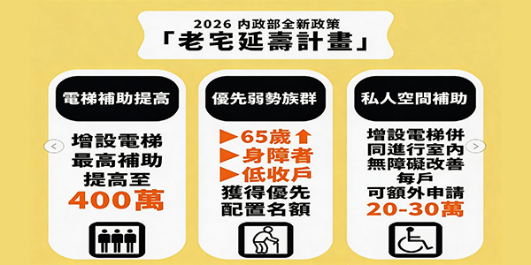 為了讓長者能在熟悉的社區安心養老,內政部國土管理署推出了「老宅延壽機能復新計畫」,投入50億元特別預算(也就是俗稱的老宅延壽50億預算),針對老舊公寓與透天厝提供修繕補助,增設電梯就是這項計畫的核心補助項目之一。
