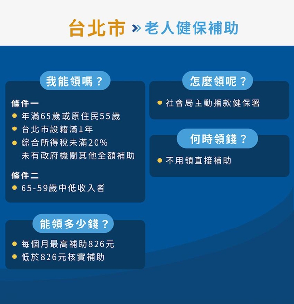 ●低收入戶:根據《公共救助法》規定,65 歲以上低收入戶可以全額免繳健保費,由中央統一補貼。